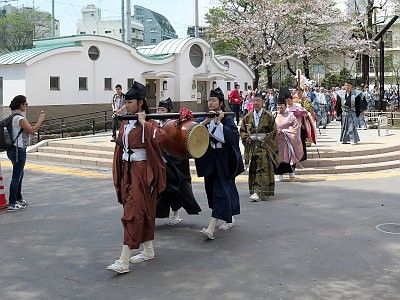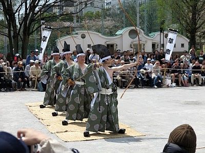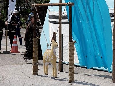 浅草草鹿は、隅田川沿いの隅田公園の山谷堀広場で浅草流鏑馬と同日に催される、小笠原流(弓馬術礼法小笠原教場)の弓術行事で、古式の装束を装った射手らが鹿型の的を射る。