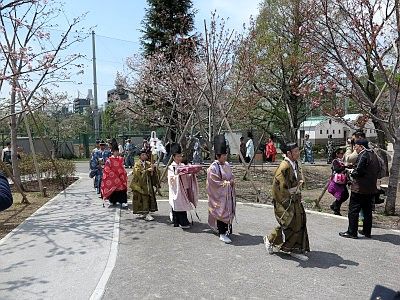 会場へは、練り行列しながら入場。なお、行事が全て終了した際にも練り行列しながら退場する。