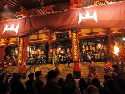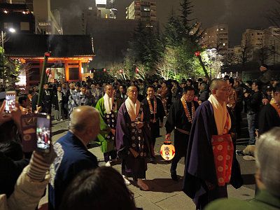3基の神輿は順次、浅草寺の本堂前から本堂内へと担ぎ上げられる(「堂上げ」)。ここでも高張提灯や篝火、松明の灯りで幻想的な風景が出現する。