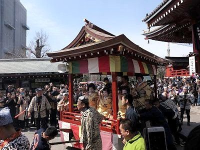 3月18日が平日の場合は、宮神輿3基の巡行行列は浅草寺本堂からの堂下げ後、本堂を時計回りに一周してそのまま浅草神社に還御する。