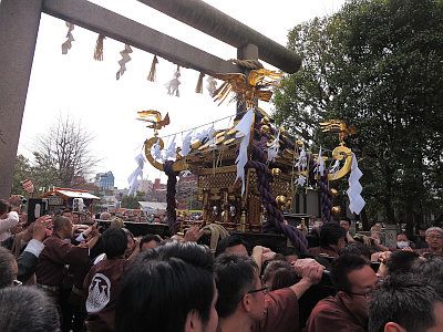 びんざさら舞奉納後、宮神輿は台車に乗せられ、祭礼行列と共に浅草寺本堂を時計回りに1周してから浅草神社の鳥居前に到着。