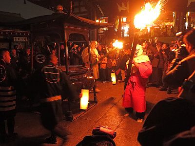 最後は銭塚地蔵堂の脇の敷地に掘られた穴に、鬼が松明を投入して行事満了。鬼が登場してより10分ほどの出来事であった。この穴には、温座秘法陀羅尼会の修法中に魑魅魍魎や餓鬼に供せられた供物があらかじめ投入されている。この施餓鬼儀式により悪霊が鎮められ、年頭の除災招福の祈願が達成される。