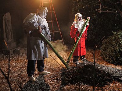 突然本堂の明かりが消え、ブザー音とともに本堂の階段上に松明を掲げた2名の鬼が現れる。