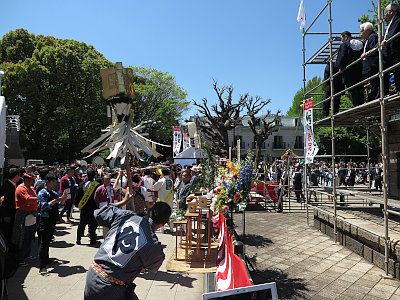 12:15頃、和太鼓が再び演奏され、着付けの終わった銅像の前へ神輿や纏が練り歩く。