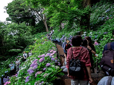 満開時に参拝したが、平日の朝9時にも関わらず眺望散策路(あじさい路)への入場は1時間待ちであった。
