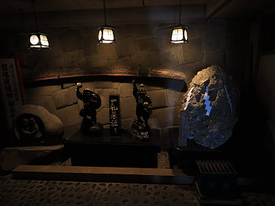 恵比寿・大黒・道祖神の像のほか、奉納された6mの木太刀も展示されている。かつて大山には木刀を納める風習があり、そのサイズや造形に凝る者も多かった。