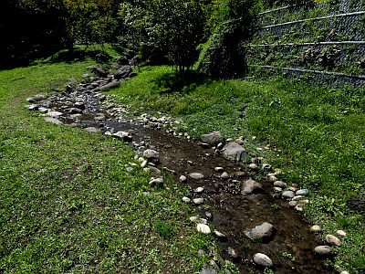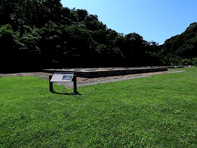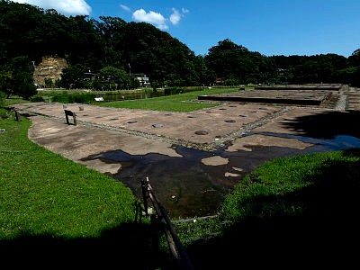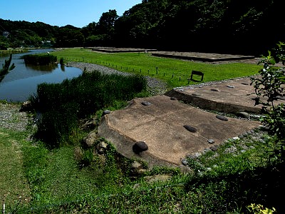 遣水跡は北翼廊の北側にあったが、整備公開にあたり盛土してその上に新たに遣水が復元された。