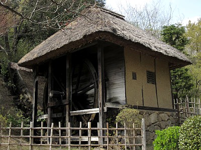 水車小屋は19世紀中期築。長野市上ケ屋で粉挽き、米つき、藁打ちに利用されていた。川崎市重要歴史記念物。