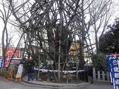 神木のイチョウは樹齢一千年以上と言われる。周囲には十二支のブロンズ像が安置されている。