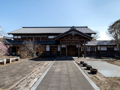 江戸後期から医師を務めた岡家の居宅跡を整備した園内には、明治43年竣工の薬医門と江戸末期竣工の蔵が残る。