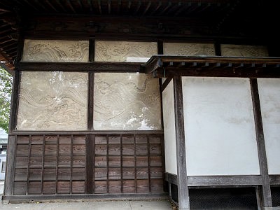 かつては本殿覆屋の四方の壁に漆喰彫刻が施されていたが、関東大震災で被災し主に東西が残った(北面も若干残されている)。