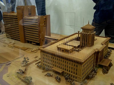 歴史展示室には木製の模型も展示されている。背後のビルは新庁舎。