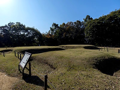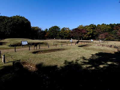 歳勝土遺跡は集落(大塚遺跡)の共同墓地。25基の方形周溝墓が発見され、うち5基を復元。