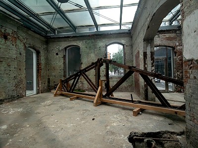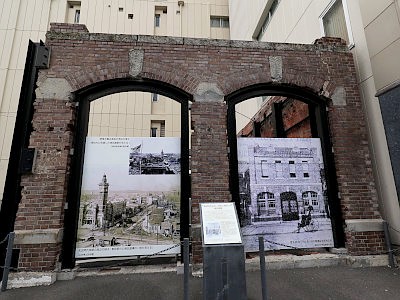 商社であった開通合名会社の社屋は明治期の木骨煉瓦造で、大正12年の関東大震災で損壊したが、外壁が残されている。