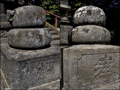 石段脇には、狛犬などの代わりに石製鏡餅が置かれている。