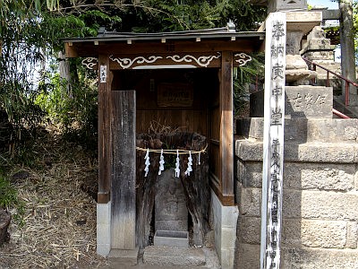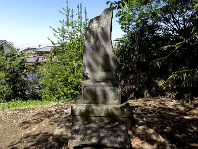 下浅間は毘沙門堂裏に伸びている古墳の墳丘上に立つ参明藤開山(さんみょうとうかいざん)碑で、造化三神を祀っている。