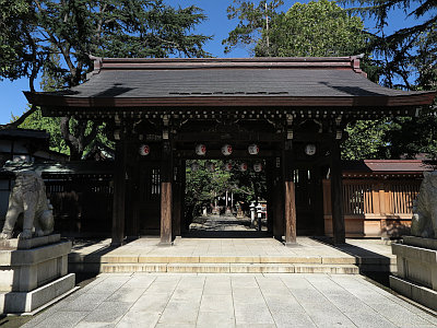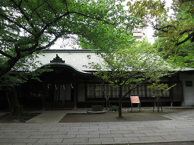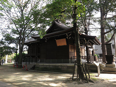 川口護国神社は川口出身の戦死者等を祀る。社殿は川口市役所の神殿を昭和23年に移築したもので、前後で屋根の長さが異なり、棟持柱も傾いている、変則的な神明造。