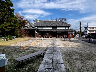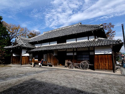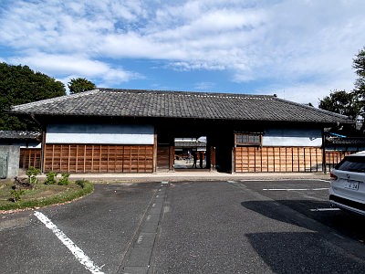長屋門は明治19年竣工で、灰色の鼠漆喰塗り。国登録有形文化財。