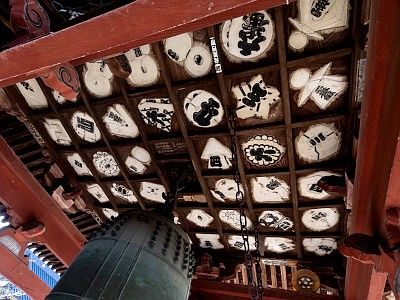 鐘楼の天井には火消しのマトイが描かれている。