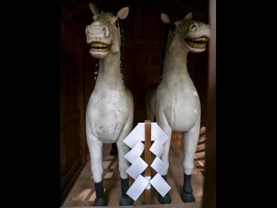 公式HPでは神馬舎だが、現地の札には神馬社とある。中には神馬の木像が安置されている。