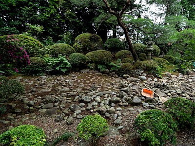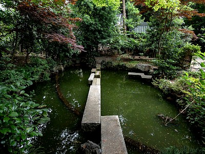 長い参道の奥には社殿のほか、日本庭園や放生池も備え、孔雀や鶏も飼育されている。