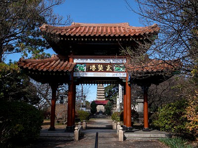 玄奘(三蔵法師)の遺骨は日本軍が昭和17年に南京で発見し、その遺骨の一部を安置するため、同25年に玄奘塔が建立された。