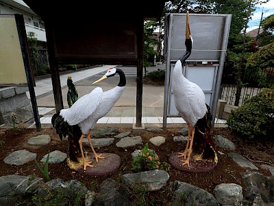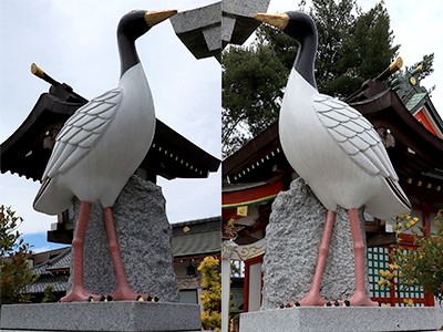 三ノ鳥居の左右には、狛犬とともに、当社の神使である天神雷鳥の像が立つ。