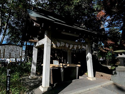 手水舎の水盤は江戸初期製作。寛永寺由来と伝え、明治期には東京上野で豆腐屋の水槽として使われていたものを移設。蕨市指定有形文化財。