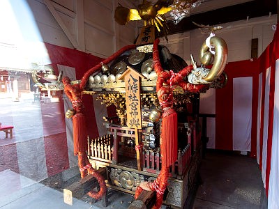 当社の例大祭は、神事は10月15日に、その近辺の週末には神輿が渡御し、特に日曜日には町神輿の連合宮入が行われる。