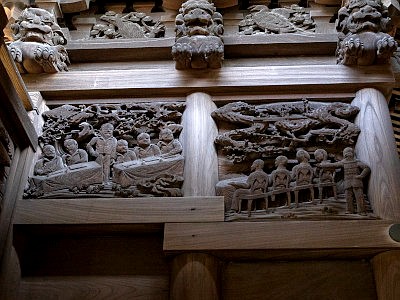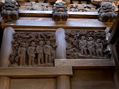 本殿の両側面には、大日本帝国憲法発布式と御前会議を題材とした彫刻がはめ込まれている。