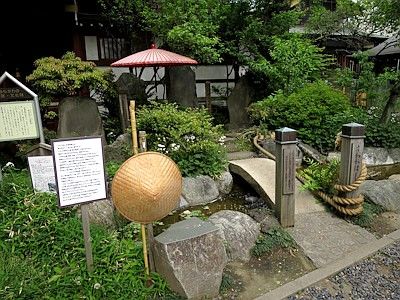 江戸時代に建てられた芭蕉碑の前には、千住大橋に見立てた石橋がある。千住は松尾芭蕉が「奥の細道」の旅立ちに当たり句を詠んだ地。