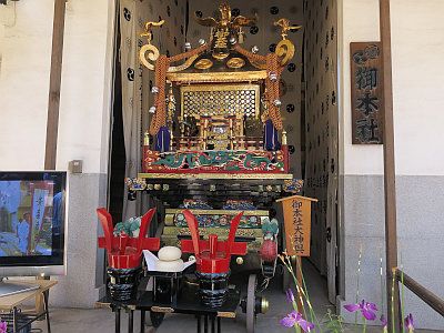 本社大神輿は俗にいう千貫神輿で、明治10年製作。神輿が載っている鳳車は大正14年調製。陰祭の年はこうして飾られるのみ。本社神輿は他に中神輿(平成7年調製)と子神輿(平成20年調製)がある。
