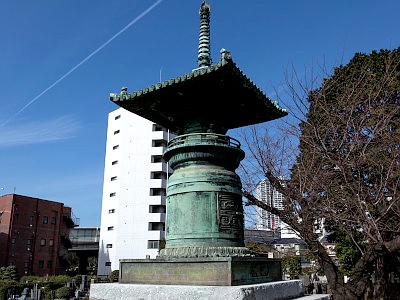 この銅製多宝塔(宝篋印塔)は、筑波山の筑波大権現・中禅寺(現・筑波山神社)に瑜伽塔として1713年に造立され、明治維新時に当寺に移された。明治35年には忠霊堂の背後に移され日本初の忠霊塔として利用された。平成8年、現在地へと移設。