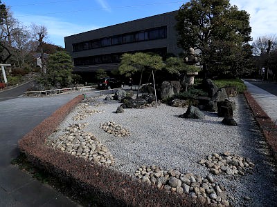 本坊は現代的なRC造建築であるが、その前には小さいながらも枯山水庭園や錦鯉の泳ぐ池がある。