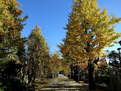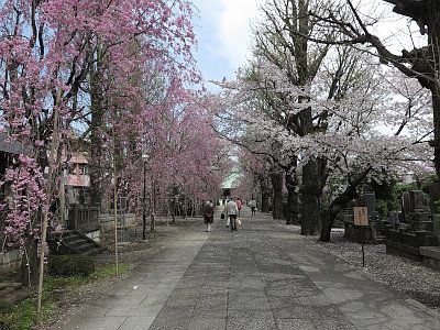 春は枝垂れ桜が美しい参道となる。この他にも、吉祥寺の境内に桜は多く植えられている。