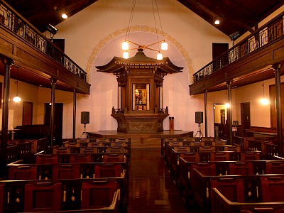 求道会館の内部はキリスト教会風の内部構成だが、大会堂の中心には六角堂の厨子がある(壁に埋め込まれているため会堂には半分しか露出していない)。