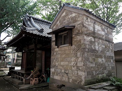 本殿覆屋は石蔵造り(房州石か)。中に収まる本殿は石祠の模様。