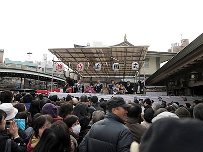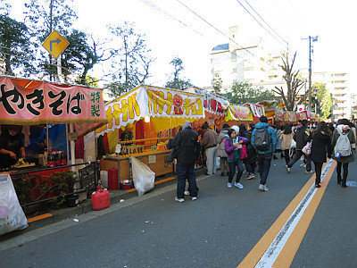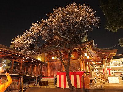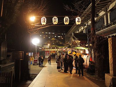 湯島天神への初詣の参拝客は多く、露店も割りと出る。下の写真は元日の昼と夜の様子。