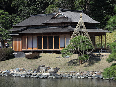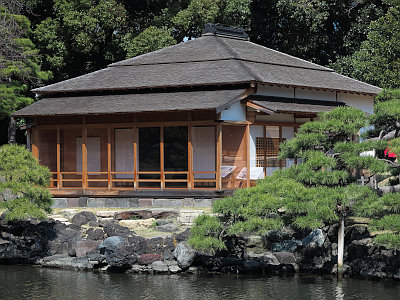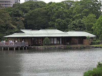 お伝い橋によって結ばれた中島には「中島の御茶屋」がある。将軍の御座所として1710年に建造され、第二次世界大戦で戦災焼失し、1983年に復元された。