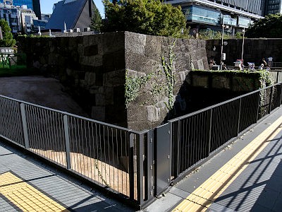 日本橋川(外濠部分)沿いの常盤橋門跡には石垣が残る。