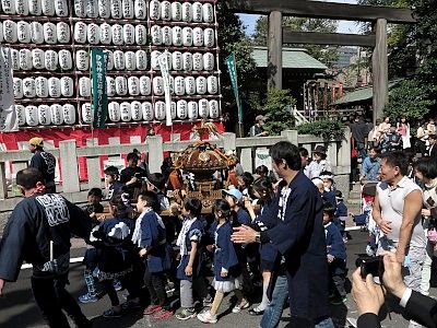 東京大神宮の例大祭は、祭儀自体は4月17日に固定されているが、奉祝行事としてその近くの日曜日に子供神輿の渡御がある。