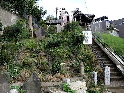 築山(?)の境内上に、小ぶりながらも特徴的な破風のある、大正7年築の不動堂が立つ。