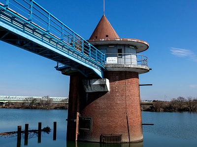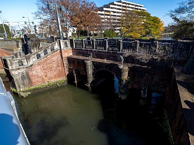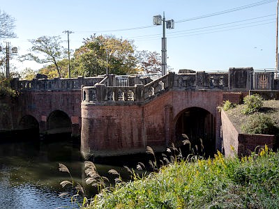 閘門橋は、明治42年竣工の装飾的なレンガ閘門。旧弐郷半領猿又閘門。葛飾区登録有形文化財。土木学会選奨土木遺産。