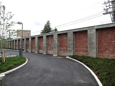 図書館に隣接する駐屯地内に、旧変圧所を部分保存したモニュメントが立つ。