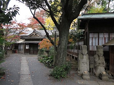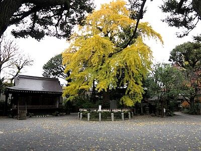 一ノ鳥居(中央奥)の前に残る、日光御成道(岩槻街道)の西ケ原一里塚は国指定史跡。