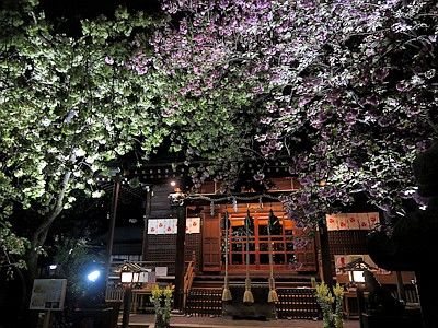 開花時期は染井吉野の終わった頃で、七社神社では夜、ライトアップされる。