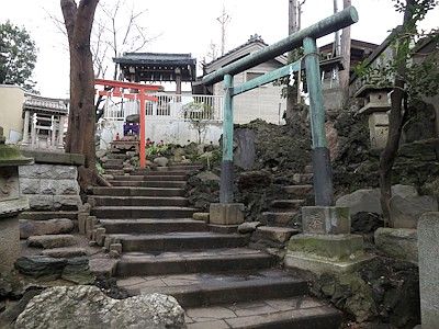 一ノ鳥居の前にある石橋は、昭和初期の改修工事によって暗渠となった谷田川(藍染川)の谷田橋を移設したもの。