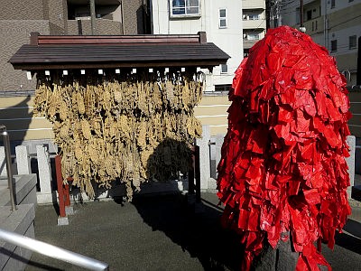 病人が、この石像の、自分の患部と同じ位置に赤紙(魔を下す火の色)を貼ると、病が治癒するとされる。願成就して治癒すれば、草履を奉納する。仁王が祈願者を見舞いに日夜歩くためという。