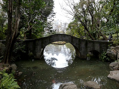 渓流に架かる太鼓橋は昭和9年開園当時のもの。RC造・石張り。