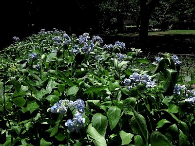都立中央図書館前の芝生の広場を囲むようにして、まとまってアジサイが植えられており、7月頃には見頃となる。